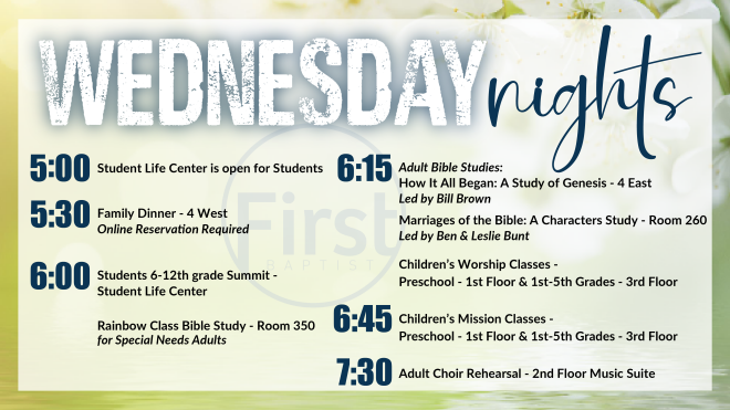 Description: Wednesday evenings are packed with lots of fun for all ages! We would love for you to join us, below is our schedule: 5:00 Student Life Center is open for...